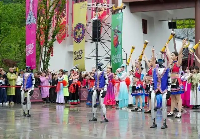 四大姓氏旗幡开道,鼓乐齐鸣;喜牛引领婚嫁队伍,展示选种送嫁、宝塔喜茶、“袋袋”相传等特色婚俗,一路分发喜糖。“动感战车”上,传统畲歌唱腔与摇滚电子节拍碰撞,畲族舞蹈与现代舞交织,畲风时装秀、创意农具演奏、全国群星奖获奖作品《阿家家》轮番上演,青春洋溢;“卖花郎”推车挑担,热情邀请游客品尝乌饭、麻糍等畲乡美食;身着56个民族盛装的演员,手拉手演绎歌舞《同心共圆中国梦》,彰显各民族同心同德的精神内核;队伍最后,身穿畲服的机器人紧随其后,一同摇摆庆祝……围观群众纷纷举起手机,记录下一个个热烈又欢乐的瞬间。