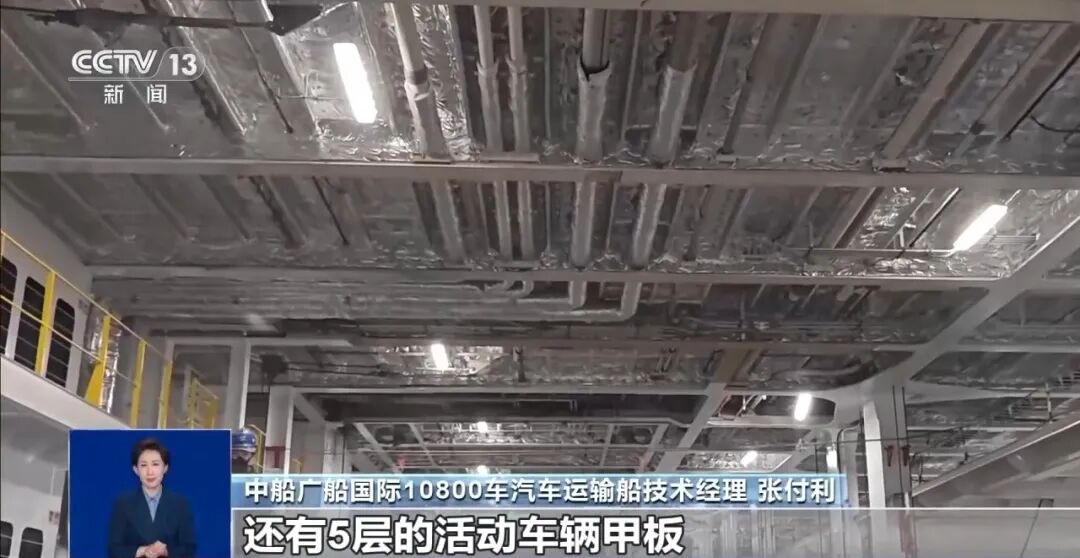 中船广船国际10800车汽车运输船技术经理 张付利:这条船有14层车辆甲板,有9层的固定车辆甲板,还有5层的活动车辆甲板。