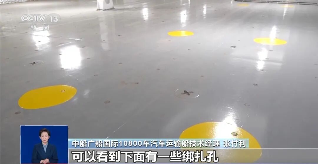 中船广船国际10800车汽车运输船技术经理 张付利:整个宽度大概有40米,长度有230米,上面这层甲板是活动甲板,如果这一层装比较高的车辆,就可以把甲板往上升,高度就够了。车辆整齐排列地停,下面有一些绑扎孔,会把绑扎钩钩到相应的位置钩住,另一边就系固在车轮上,因为海上有时风浪比较大,会有一点颠簸。