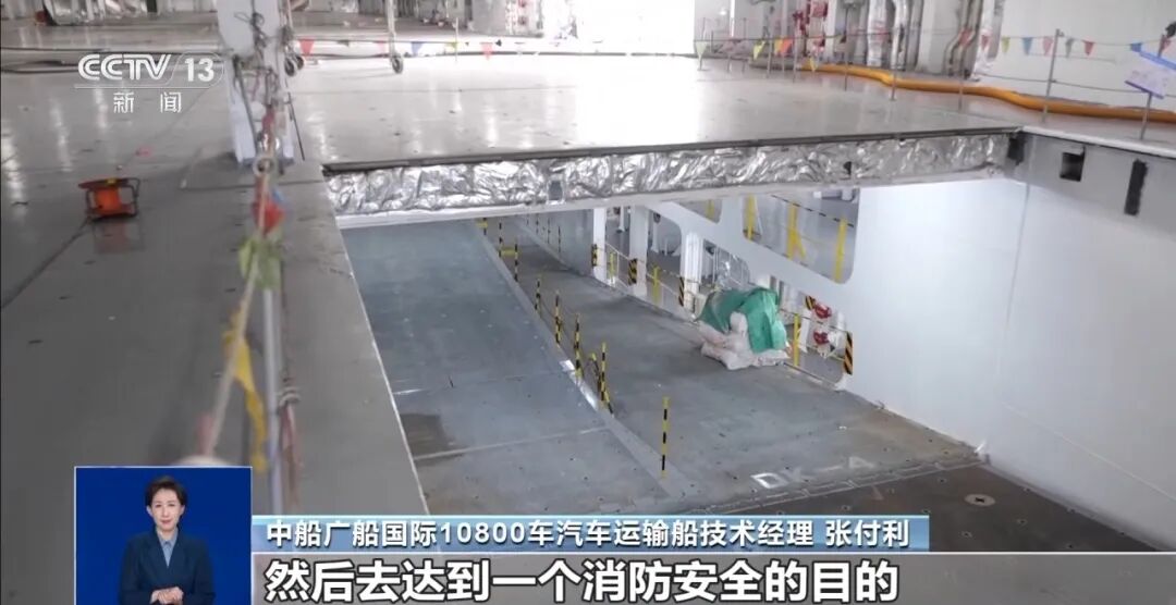 中船广船国际10800车汽车运输船技术经理 张付利:因为这条船要装氢燃料或LNG燃料的汽车,这些都有防爆要求,所以这条船用了液压系统,可以防爆,能装载很多新能源的汽车。不同的区域装不同类型的车辆,达到消防安全的目的。