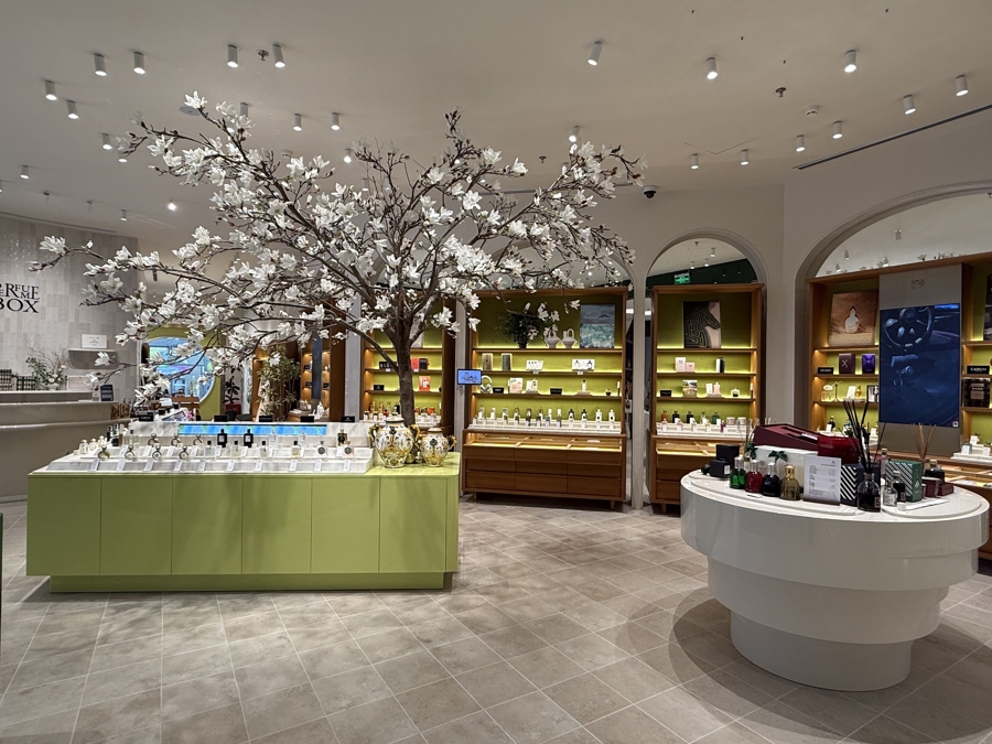 去年底,香氛集合品牌PERFUME BOX拾氛气盒在上海新天地东台里开设首家以在地文化为主题的形象旗舰店,主题定为“屋里香”,取自上海话中“家”的谐音。店如其名,以家为设计思路,打造了多个场景化的选香空间:进门的“玄关”,摆放了愉悦果香的居家香氛;玉兰树下的“庭院”,放置品牌香水供消费者集中挑选;靠墙一排“书柜”,陈列沙龙香水,搭配表达相同文化主题的精选书籍,供消费者品阅;后方的家居区,摆放沙发、箱橱、洗漱台等,仿佛旅程结束,即将回家洗漱……